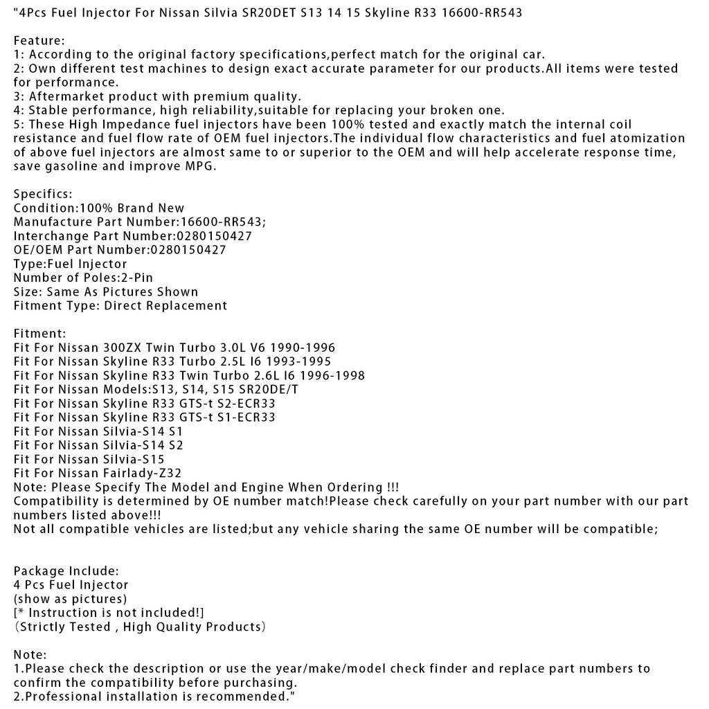 4 iniettori di carburante per Nissan Silvia SR20DET S13 14 15 Skyline R33 16600-RR543