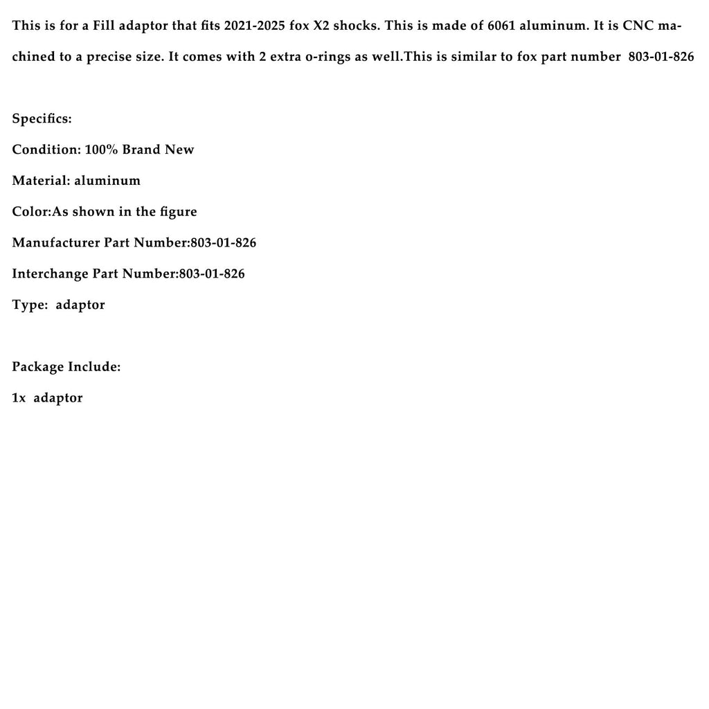 Questo è un adattatore di riempimento compatibile con gli ammortizzatori Fox X2 2021-2025. Realizzato in alluminio 6061, è lavorato CNC su misura. Viene fornito con due O-ring aggiuntivi. Simile al codice Fox 803-01-826.