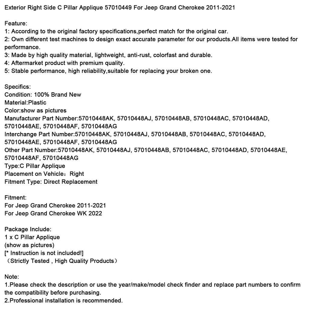 Rivestimento montante C esterno destro 57010449 per Jeep Grand Cherokee 2011-2021