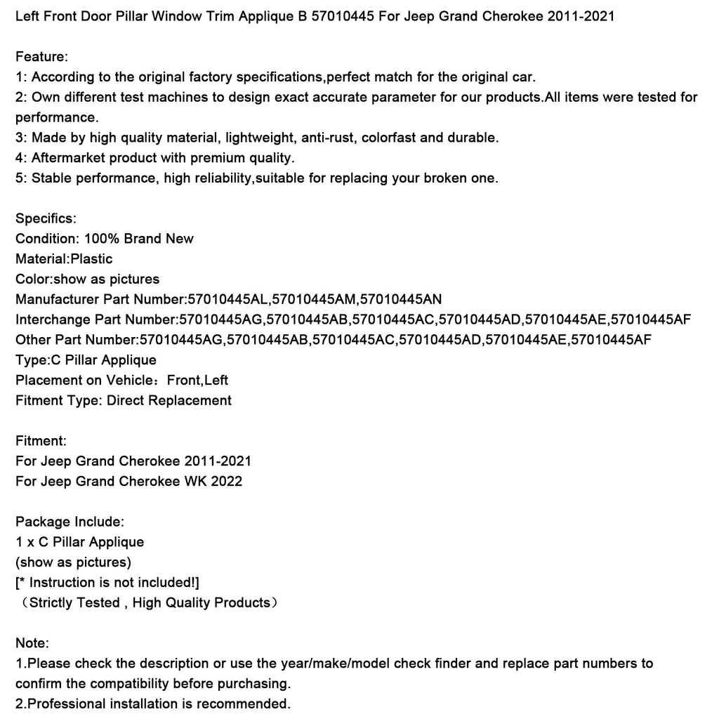 Rivestimento del finestrino del montante della portiera anteriore sinistra, applique B 57010445 per Jeep Grand Cherokee 2011-2021