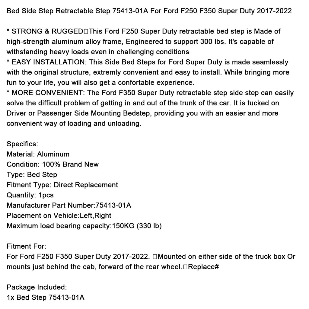 * ROBUSTO E RESISTENTE: questo predellino retrattile per Ford F250 Super Duty è realizzato con un telaio in lega di alluminio ad alta resistenza, progettato per supportare 300 libbre. È in grado di gestire carichi pesanti anche in condizioni difficili.