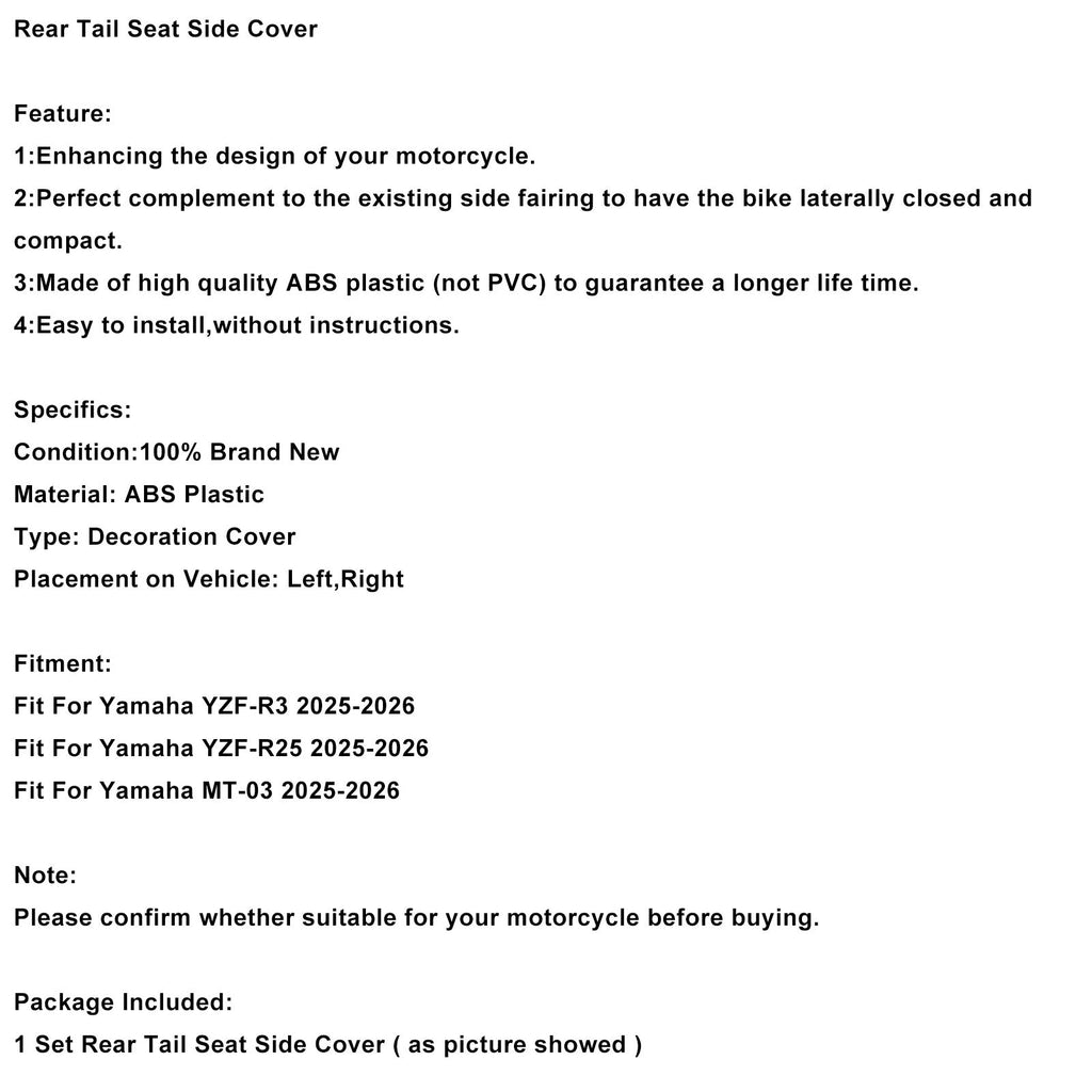 Copertura laterale sella posteriore compatibile con Yamaha YZF-R3 R25 MT-03 2025-2026