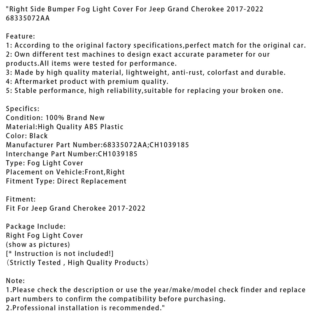 Copertura fendinebbia paraurti destro compatibile con Jeep Grand Cherokee 2017-2022 68335072AA