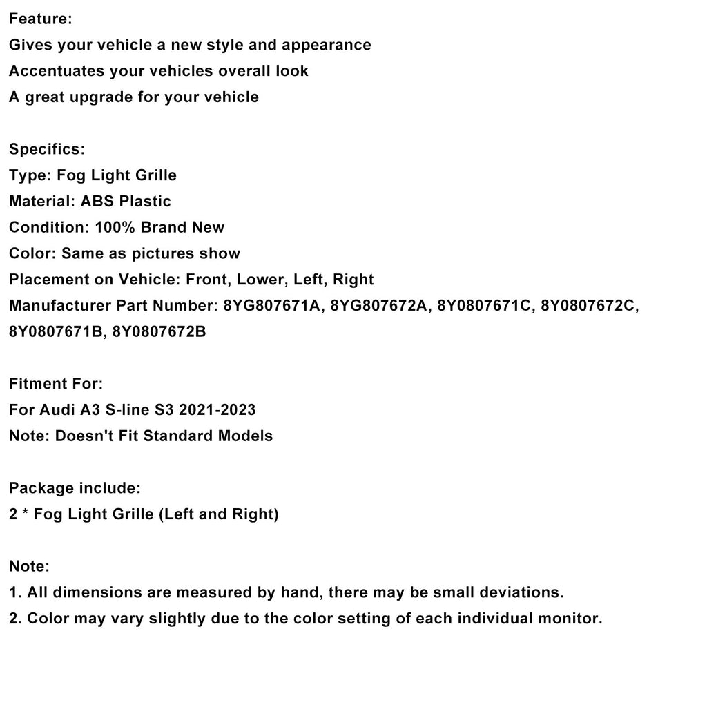 Griglia fendinebbia anteriore a nido d'ape nera compatibile con Audi A3 S-line 2021-2023