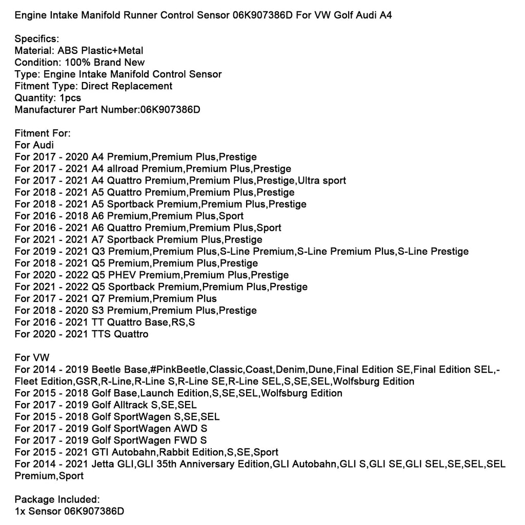 Sensore di controllo del collettore di aspirazione del motore 06K907386D per VW Golf Audi A4