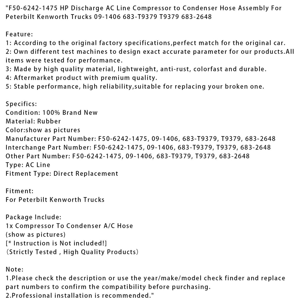 Gruppo tubo di scarico aria condizionata F50-6242-1475 HP, compressore a condensatore, per camion Peterbilt e Kenworth 09-1406 683-T9379 T9379 683-2648