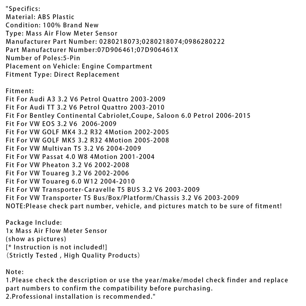 Sensore del flussometro di massa d'aria per VW Golf MK5 Audi A3 TT 3.2 Bentley 0280218073