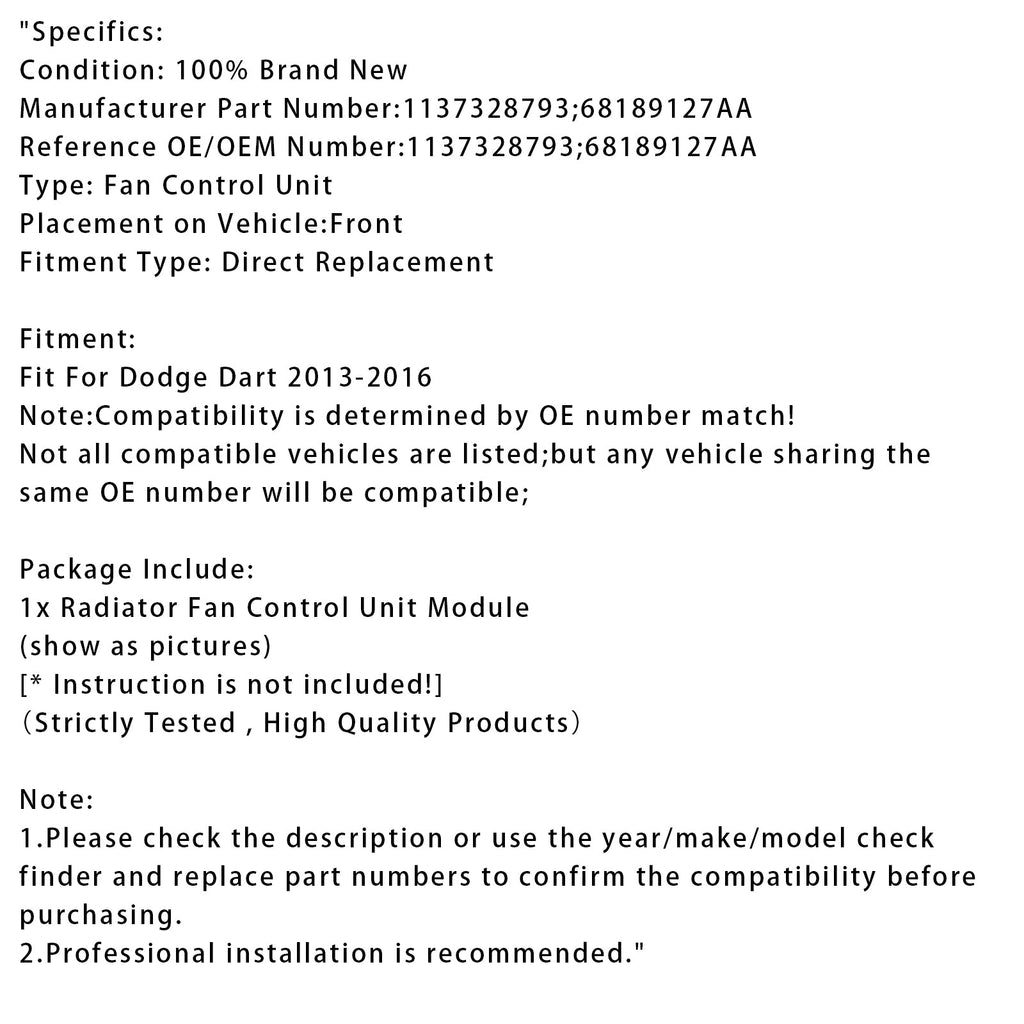 Modulo di controllo della ventola del radiatore compatibile con Dodge Dart 2013-2016 1137328793 68189127AA