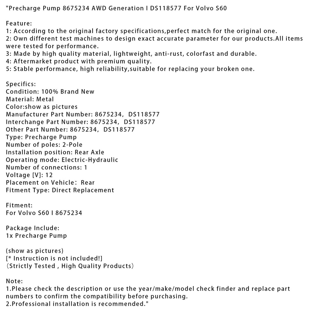 Pompa di precarica 8675234 AWD Generazione I DS118577 per Volvo S60