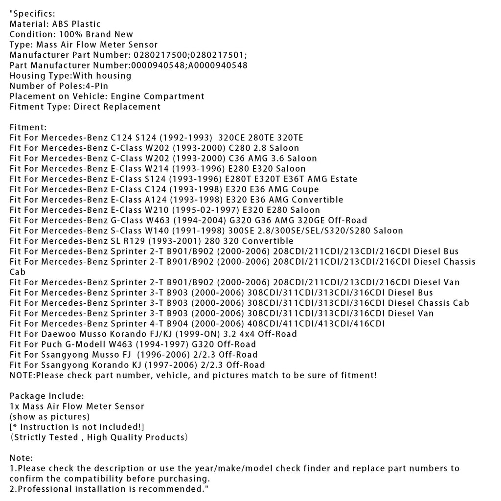 Sensore di portata d'aria di massa per Mercedes W202 W140 Sprinter 2-T 3-T 0280217500