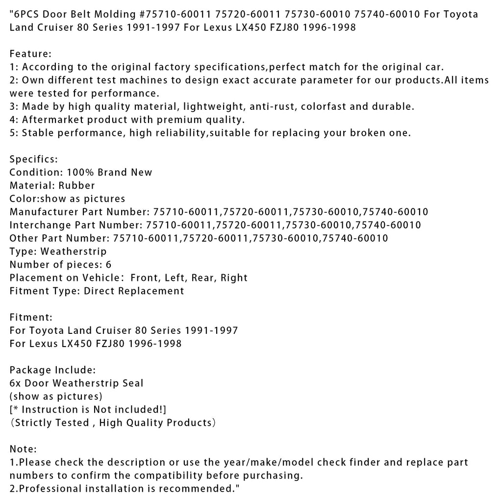 Deurlijstlijsten (6 stuks) #75710-60011 75720-60011 75730-60010 75740-60010 Voor Toyota Land Cruiser 80-serie (1991-1997) en Lexus LX450 FZJ80 (1996-1998)