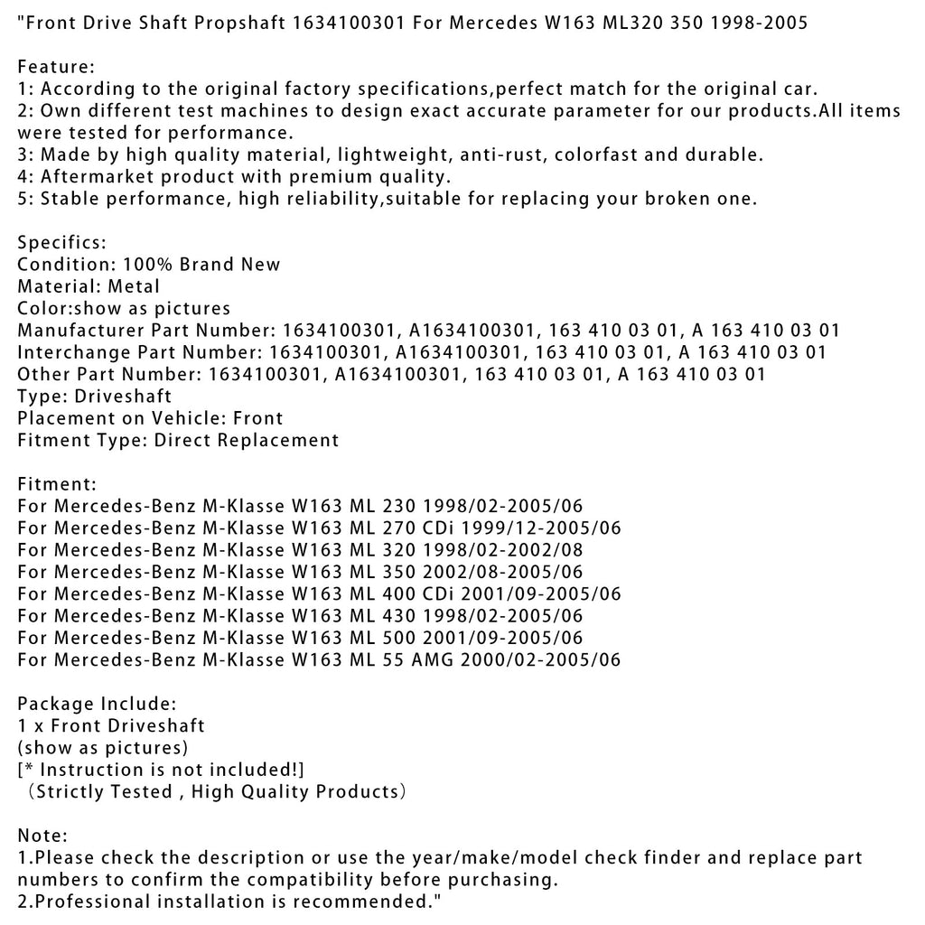 Voorste aandrijfas 1634100301 voor Mercedes W163 ML320 350 1998-2005