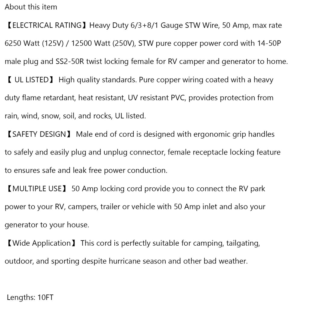 Over dit item 【ELEKTRISCHE KLASSE】STW zware kabel 6/3+8/1, 50 Amp, 6250 Watt (125V) / 12500 Watt (250V) Max. vermogen, STW puur koperen netsnoer met stekker 14-50P mannelijk en SS2- 50R vergrendelingsvrouwtje voor campercamper en thuisgenerator. 【UL GECERTIFICEERD】Hoge kwaliteitsnormen. Zuiver koperen bedrading gecoat met vlamvertragend, hitte- en UV-bestendig PVC, dat bescherming biedt tegen regen, wind, sneeuw, grond en rotsen, UL-gecertificeerd. 【VEILIGHEIDSONTWERP】Het mannelijke uiteinde van het snoer is uitgerust met ergonomische handgrepen om het aansluiten en loskoppelen van de connector veilig en gemakkelijk te maken, en de vergrendelingsfunctie van de vrouwelijke stekker zorgt voor een veilige en lekvrije elektrische geleiding. 【MEERVOUDIG GEBRUIK】 Met het 50 ampère sluitsnoer kunt u camperparkstroom aansluiten op uw camper, campers, aanhangwagens of voertuig met een ingang van 50 ampère, evenals uw generator op uw huis. 【Brede toepassing】Dit snoer is perfect geschikt voor kamperen, bumperkleven, buiten- en sportactiviteiten, ondanks het orkaanseizoen en ander slecht weer.