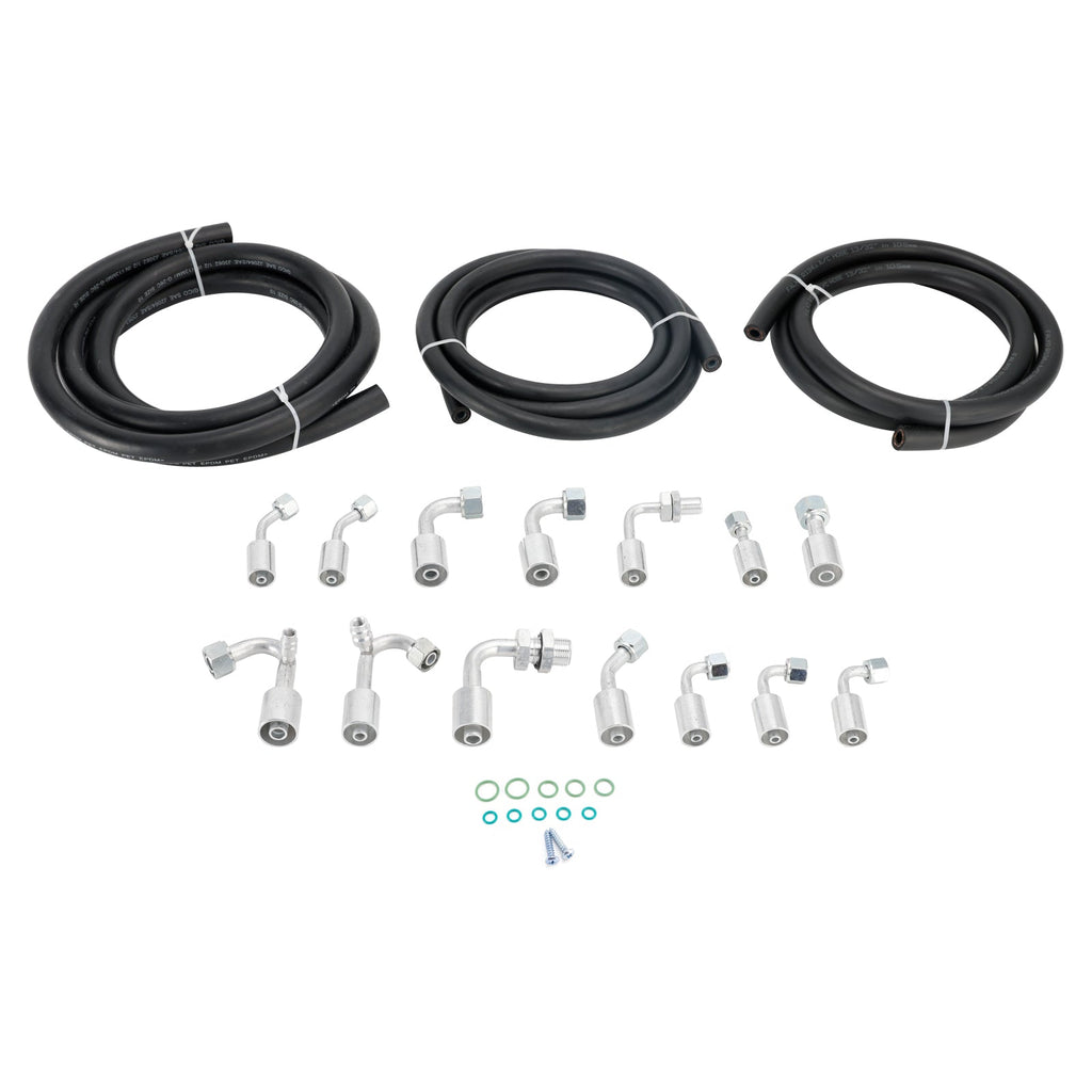 De set met airconditioningslangen bevat drie airconditioningslangen, O-ringen en de benodigde koppelingen voor de installatie, inclusief aansluitingen voor auto-airconditioning.