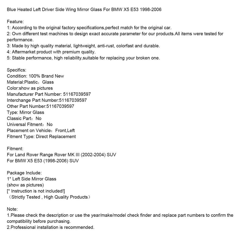 Verwarmde blauwe linkerspiegel voor de bestuurderszijde van de BMW X5 E53 (1998-2006)