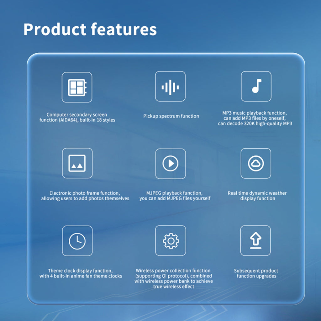 De schermresolutie is 360X360 met een capacitief touchscreen. De module omvat een LCD-display, achtergrondverlichting drivercircuit, touchscreen drivercircuit, 12S digitaal microfooncircuit, 12S analoog-naar-digitaal conversiecircuit, TF-kaartinterface, draadloos voedingscircuit.