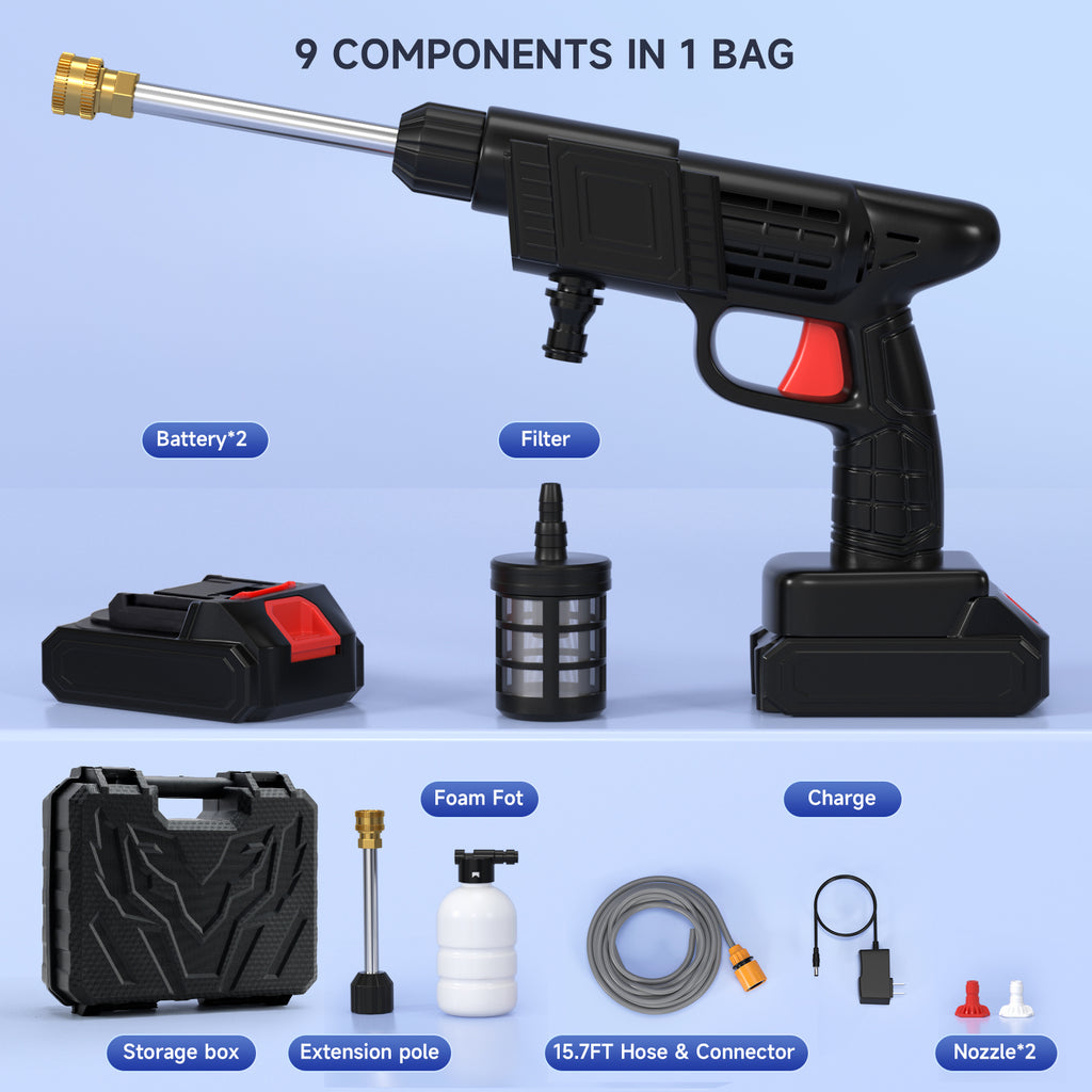 Krachtige motor: Deze draadloze autohogedrukreiniger is uitgerust met een motor van zuiver koper. In tegenstelling tot traditionele motoren drijft deze volledig koperen motor de commerciële structuurpomp aan, waardoor de waterdruk aanzienlijk met 86% wordt verhoogd, wat zorgt voor een efficiëntere, stabielere en duurzamere machine.