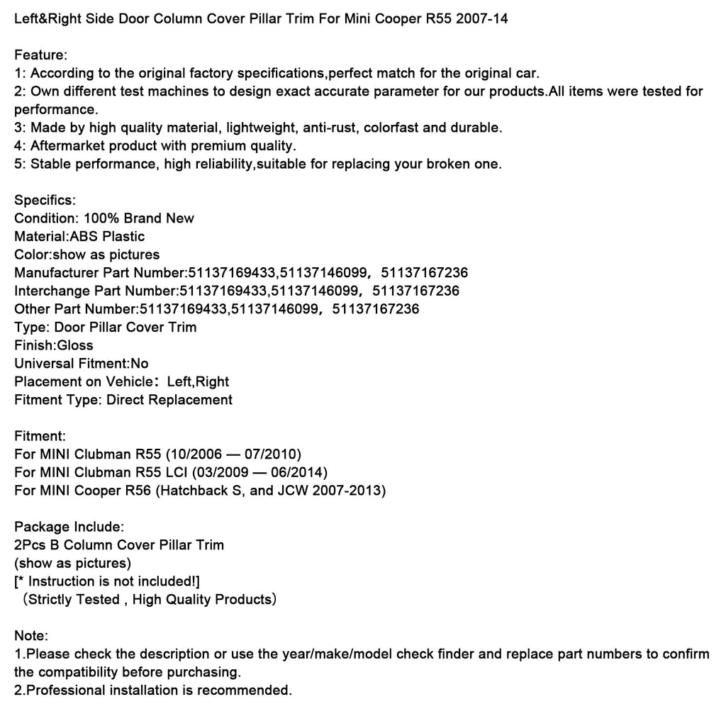 Linker- en rechterdeurstijlbekleding voor Mini Cooper R55 2007-2014
