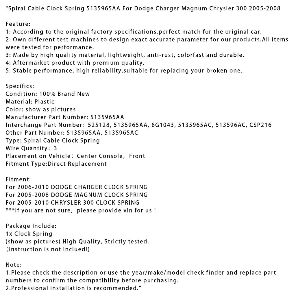 Spiraalkabelklokveer 5135965AA voor Dodge Charger Magnum Chrysler 300 2005-2008