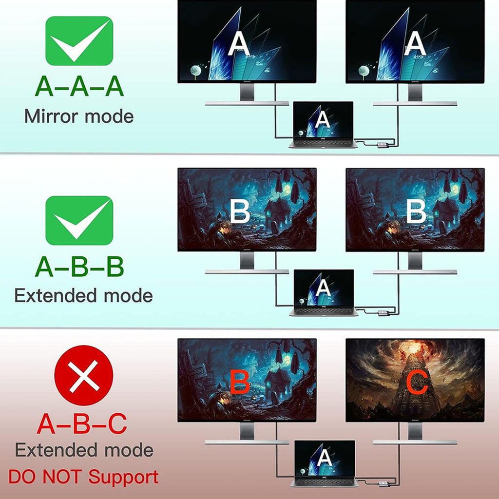 5. Spiegel- en uitbreidingsmodus: Windows/MacOS-systemen ondersteunen alleen de spiegelmodus (AAA) en de uitbreidingsmodus (ABB), terwijl Android/Win XP alleen de spiegelkopiemodus (AAA) ondersteunt. OPGEMERKT : Uitgebreide ABC-modi worden niet ondersteund.