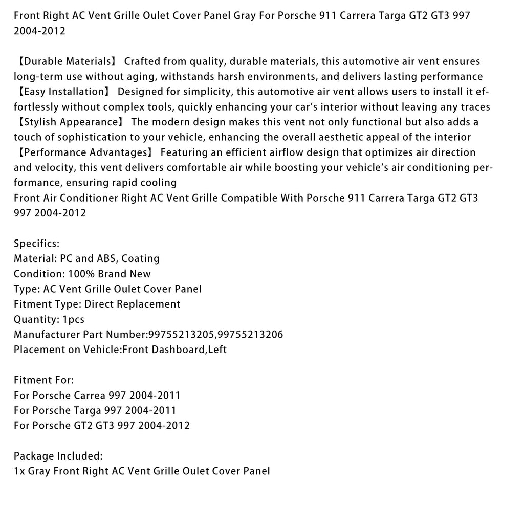 Rechter voorste ventilatierooster voor de airconditioning, compatibel met Porsche 911 Carrera Targa GT2 GT3 997 (2004-2012)