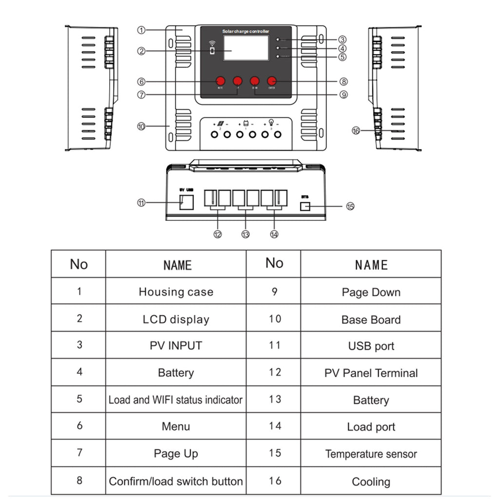 4. Wbudowane zabezpieczenie przed zamknięciem obciążenia, zabezpieczenie przed zwarciem, zabezpieczenie przed otwarciem obwodu i zabezpieczenie przed odwrotnym podłączeniem. Wszystkie funkcje odzyskują sprawność automatycznie i nie uszkadzają kontrolera.