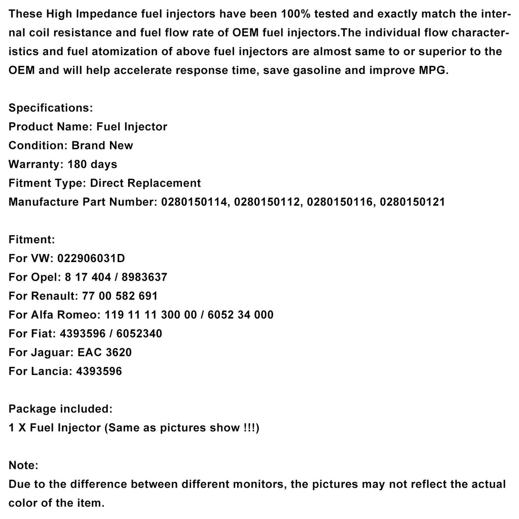Te wtryskiwacze paliwa o wysokiej impedancji zostały w 100% przetestowane i idealnie odpowiadają rezystancji cewki wewnętrznej oraz przepływowi paliwa wtryskiwaczy OEM. Charakterystyka przepływu i rozpylanie paliwa w powyższych wtryskiwaczach są niemal identyczne lub lepsze niż w przypadku OEM, co przyczynia się do przyspieszenia czasu reakcji, oszczędności paliwa i zmniejszenia zużycia paliwa.
