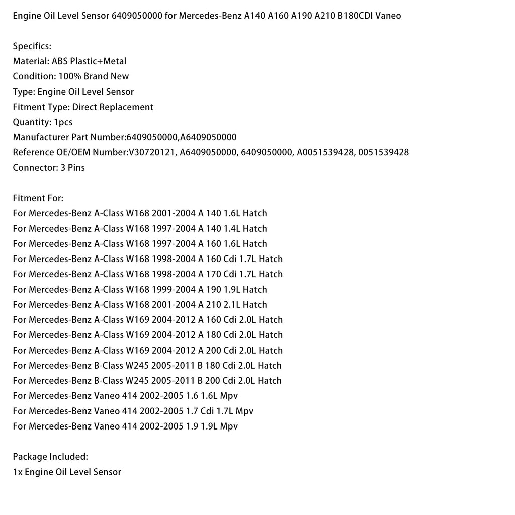 Czujnik poziomu oleju silnikowego 6409050000 kompatybilny z Mercedes-Benz A140 A160 A190 A210 B180CDI Vaneo