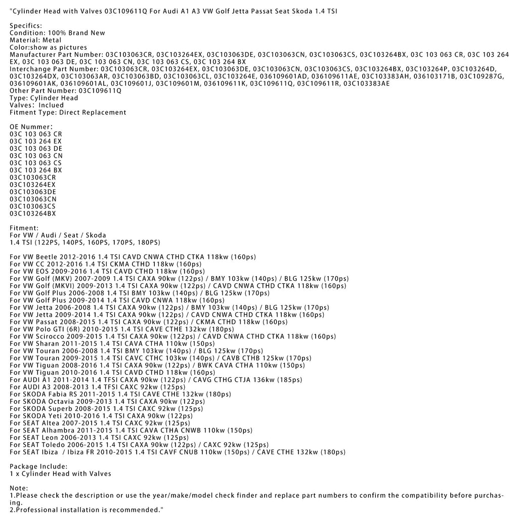 Głowica cylindra z zaworami 03C109611Q do Audi A1 A3 VW do Golfa Jetta Passata Seat Skoda 1.4 TSI