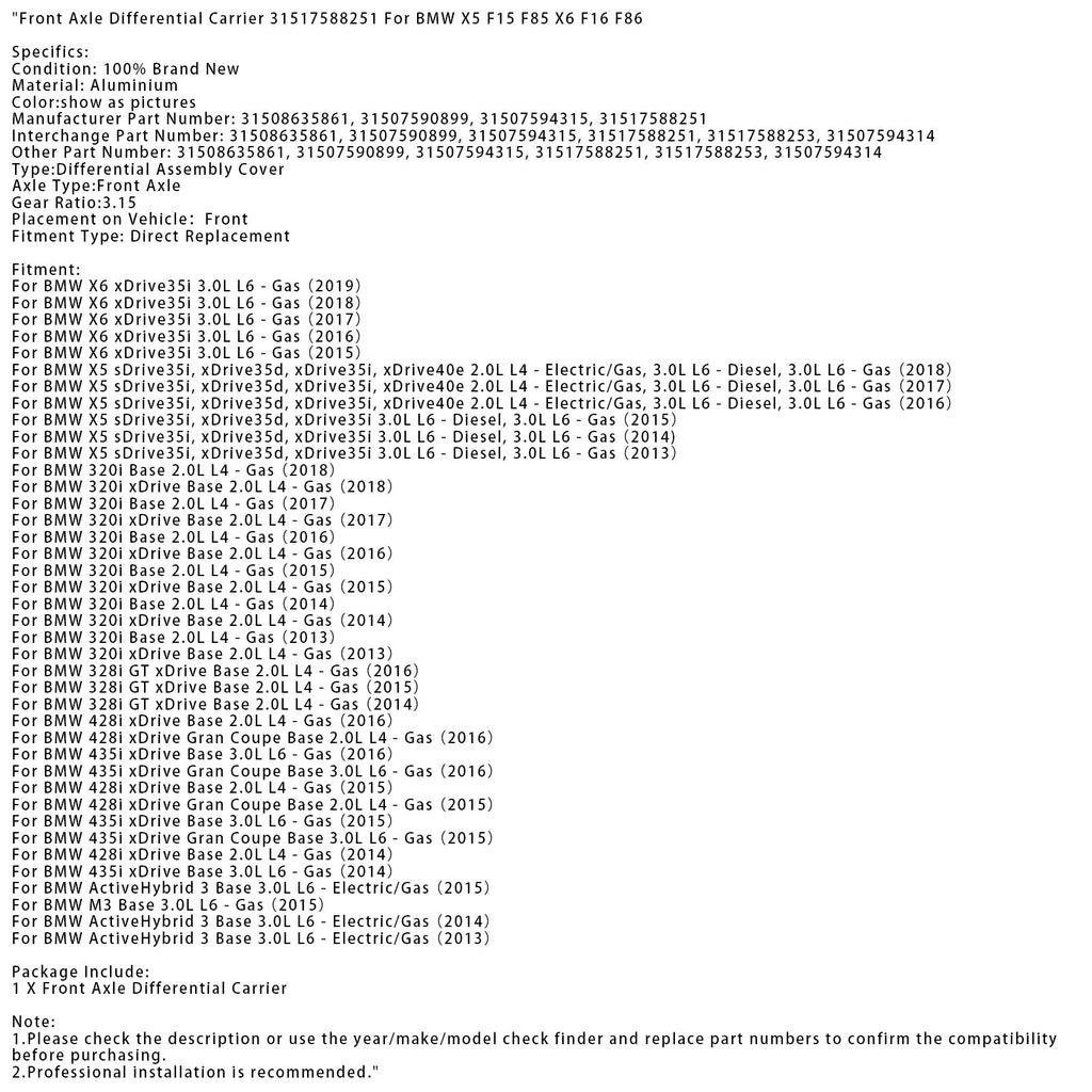 Obsługa różnicowa osi świadczeń 31517588251 31508635861 dla BMW 328I GT XDRIVE BASE 2,0L L4 2014-2016