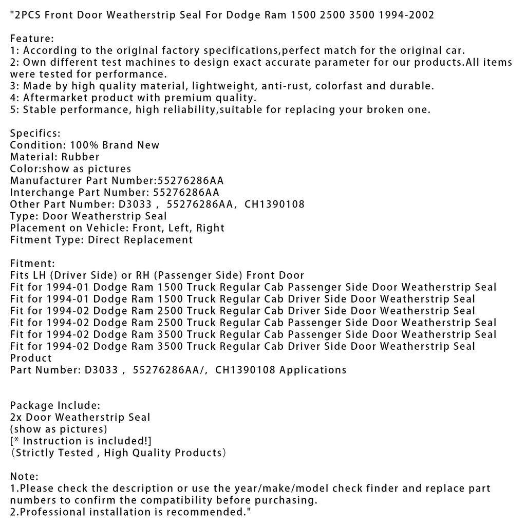 Uszczelka drzwi przednich 2 szt. do Dodge Ram 1500, 2500, 3500, 1994-2002