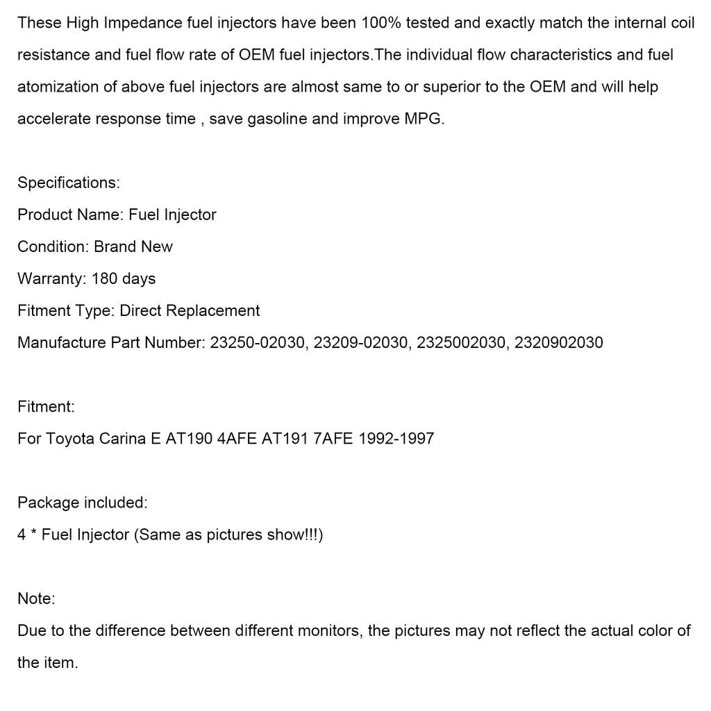 Te wtryskiwacze paliwa o wysokiej impedancji zostały w 100% przetestowane i dokładnie odpowiadają rezystancji cewki wewnętrznej i natężeniu przepływu paliwa wtryskiwaczy paliwa OEM. Indywidualne właściwości przepływu paliwa i atomizacji powyższych wtryskiwaczy paliwa są prawie takie same lub lepsze niż w przypadku wtryskiwaczy OEM i zapewniają szybszy czas reakcji, oszczędność benzyny i poprawę zużycia paliwa.