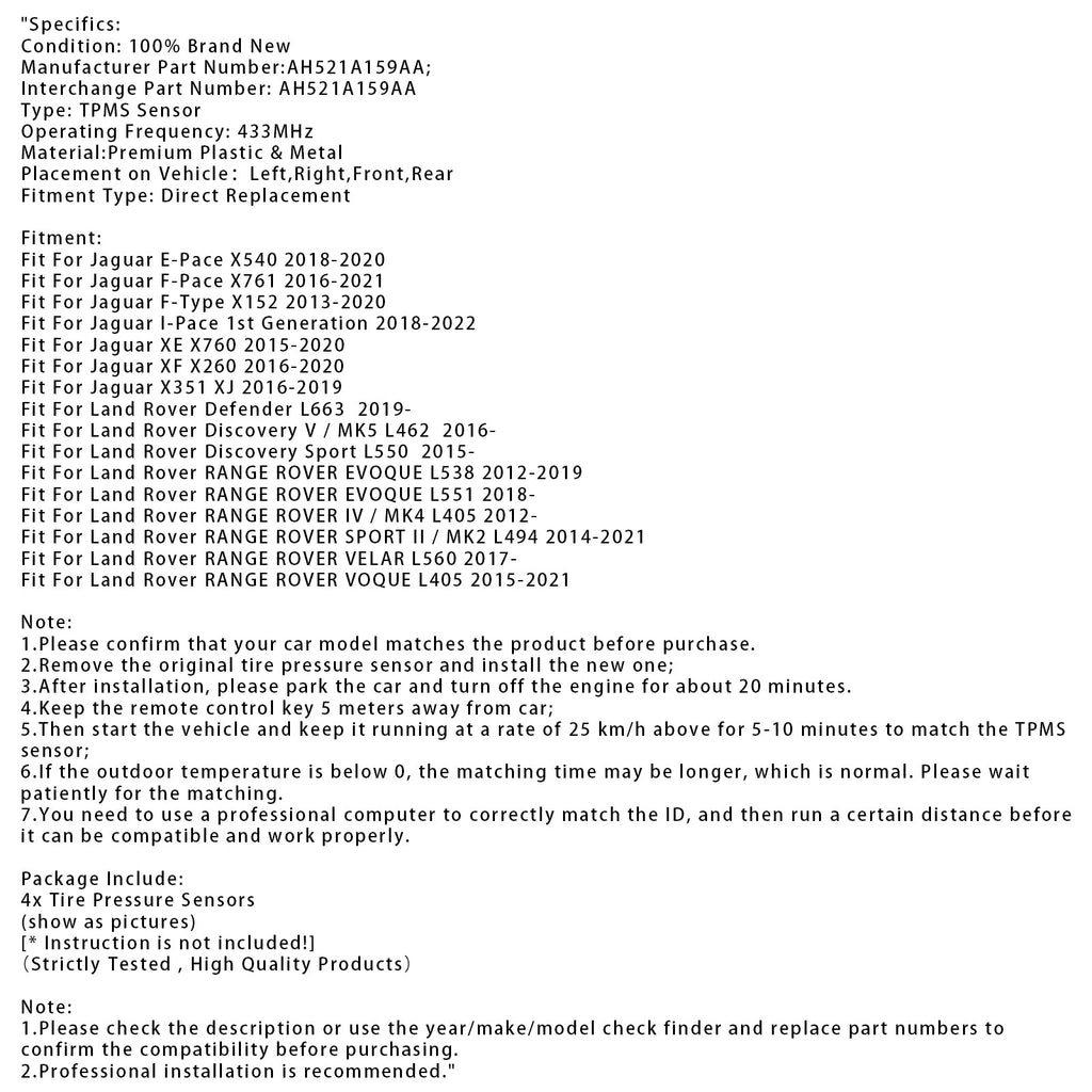 4X Czujnik ciśnienia w oponach TPMS do Land Rovera Jaguara AH521A159AA