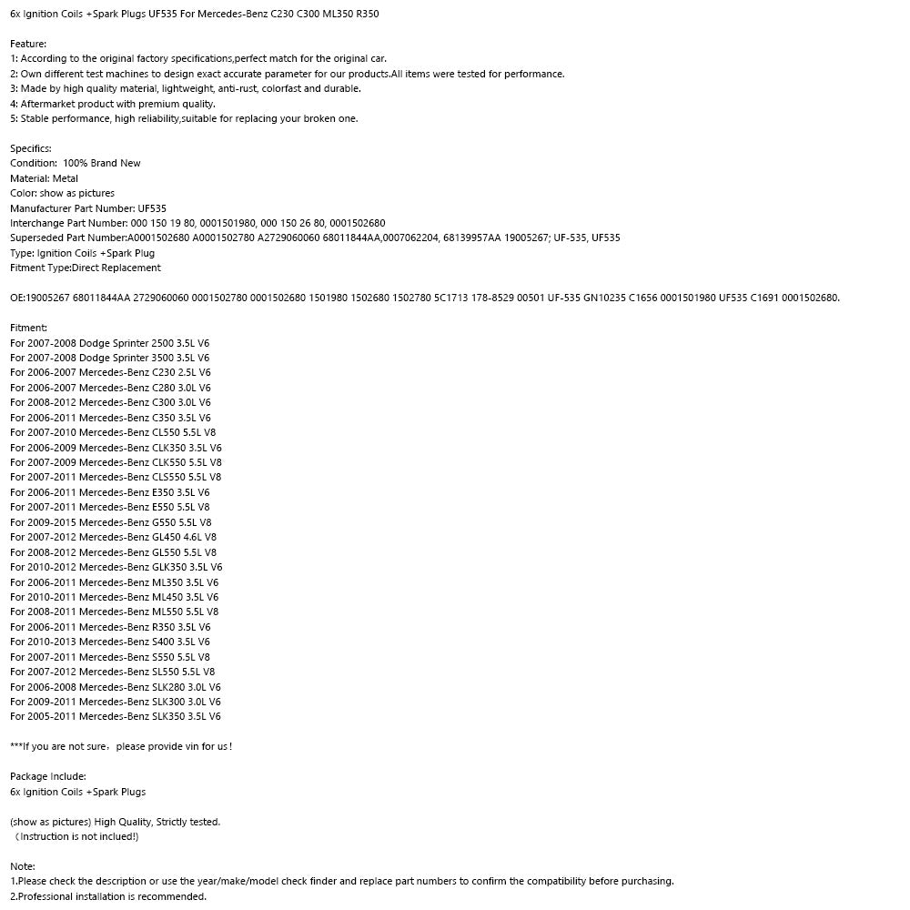 6x cewka zapłonowa + świeca zapłonowa uf535 do Mercedesa - Benz C230 c300 ml350 r350