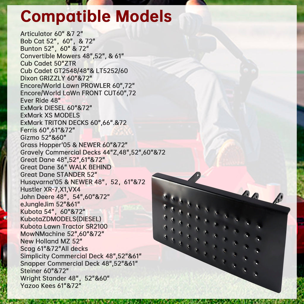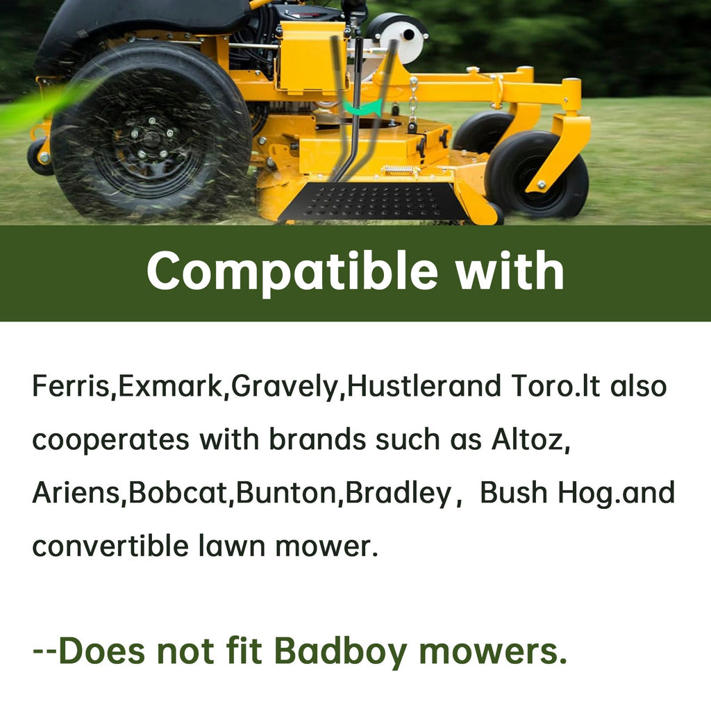 Kosiarki o zerowym promieniu skrętu – zaprojektowane tak, aby pasowały do różnych kosiarek o zerowym promieniu skrętu, w tym Ferris, Exmark, Gravely, Hustler i Toro. Jest on również kompatybilny z takimi markami jak Altoz, Ariens, Bobcat, Bunton, Bradley, Bush Hog, kosiarkami kabrioletowymi itp. Aby zapoznać się z konkretnymi modelami, zapoznaj się ze zdjęciem produktu.
