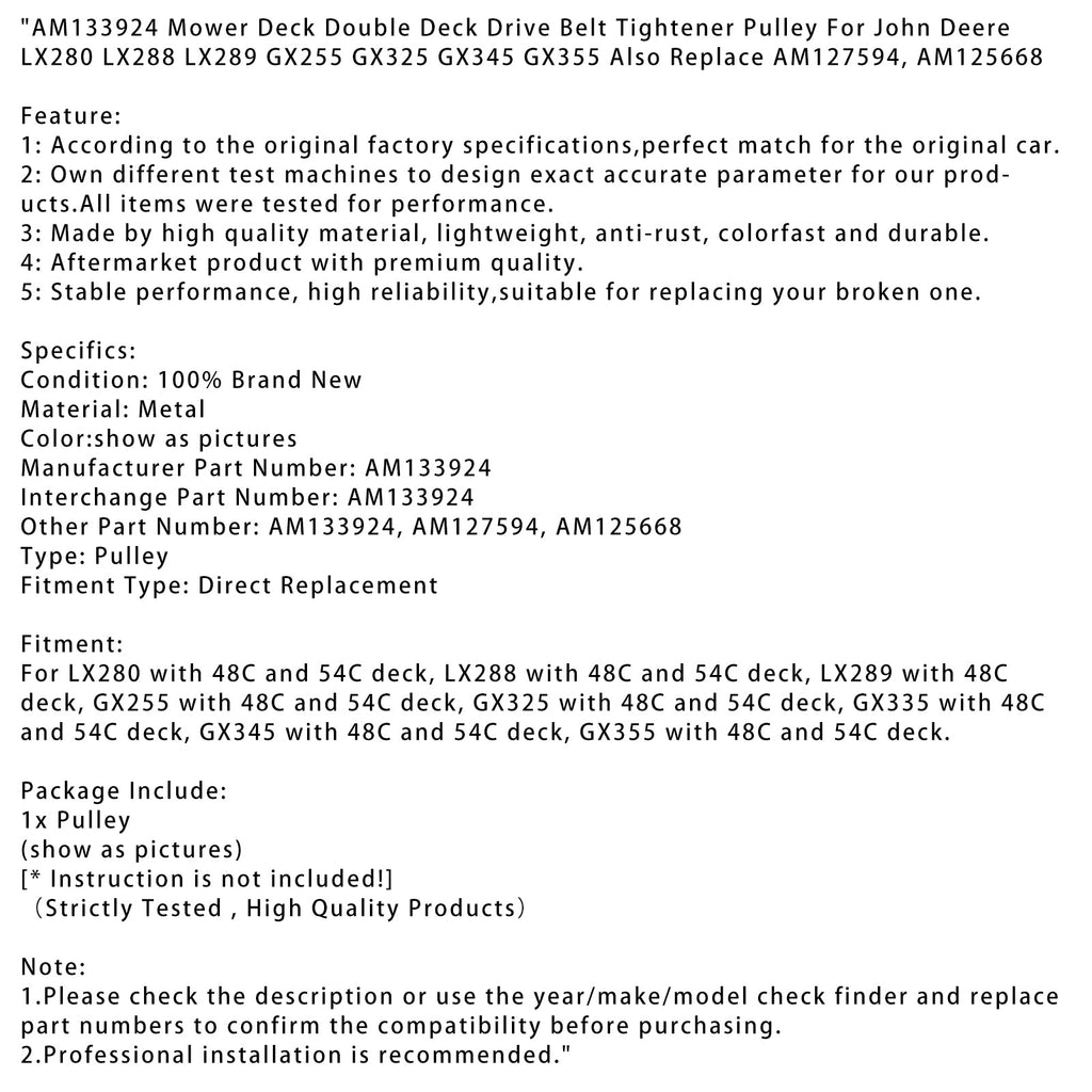 AM133924 Koło napinacza paska napędowego kosiarki dwurzędowej John Deere LX280 LX288 LX289 GX255 GX325 GX345 GX355 Zastępuje również AM127594, AM125668