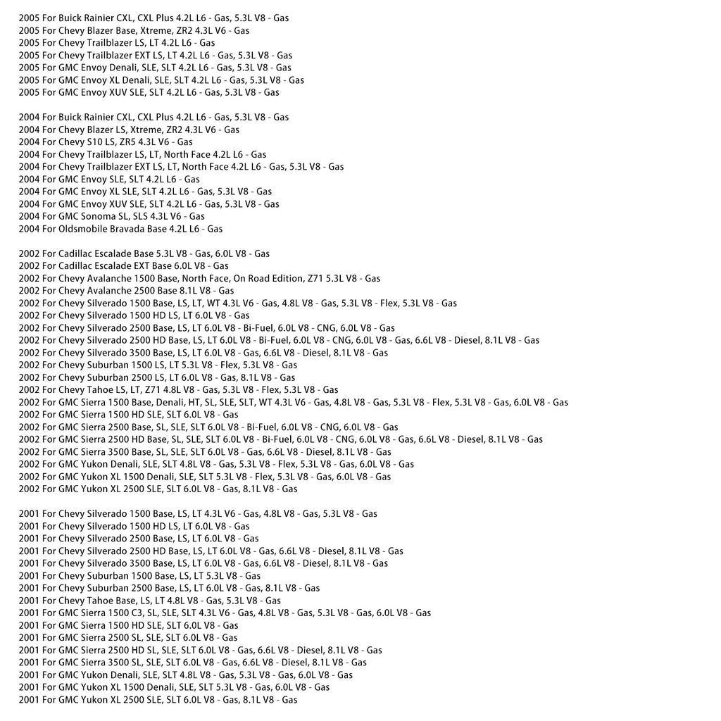 2002 Dla GMC Sierra 1500 Base, Denali, HT, SL, SLE, SLT, WT 4,3 l V6 - benzyna, 4,8 l V8 - benzyna, 5,3 l V8 Flex, 5,3 l V8 - benzyna, 6,0 l V8 - benzyna
