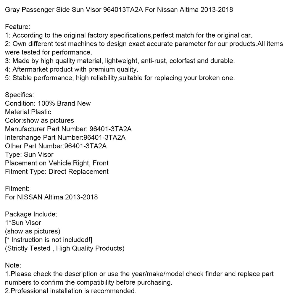 Szara osłona przeciwsłoneczna pasażera 964013TA2A do Nissana Altima 2013-2018