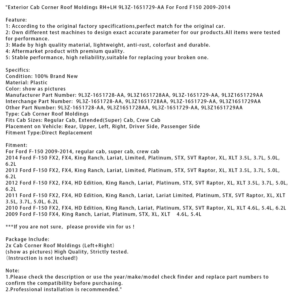 Listwy narożne i dachowe zewnętrzne kabiny, prawe i lewe, 9L3Z-1651729-AA do Forda F150 2009-2014