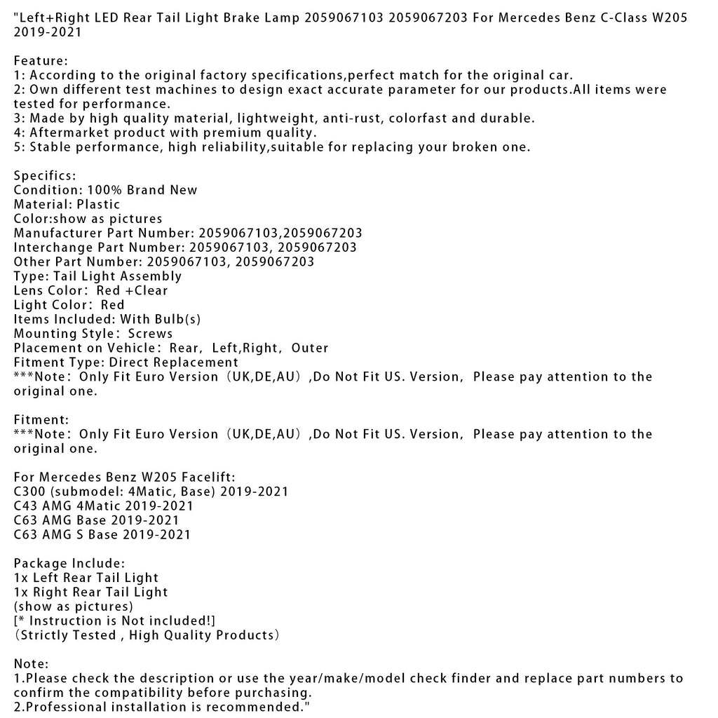 Lewe i prawe tylne światła LED, światła stopu, numery części 2059067103 i 2059067203, kompatybilne z Mercedes-Benz Klasy C W205 (2019-2021)