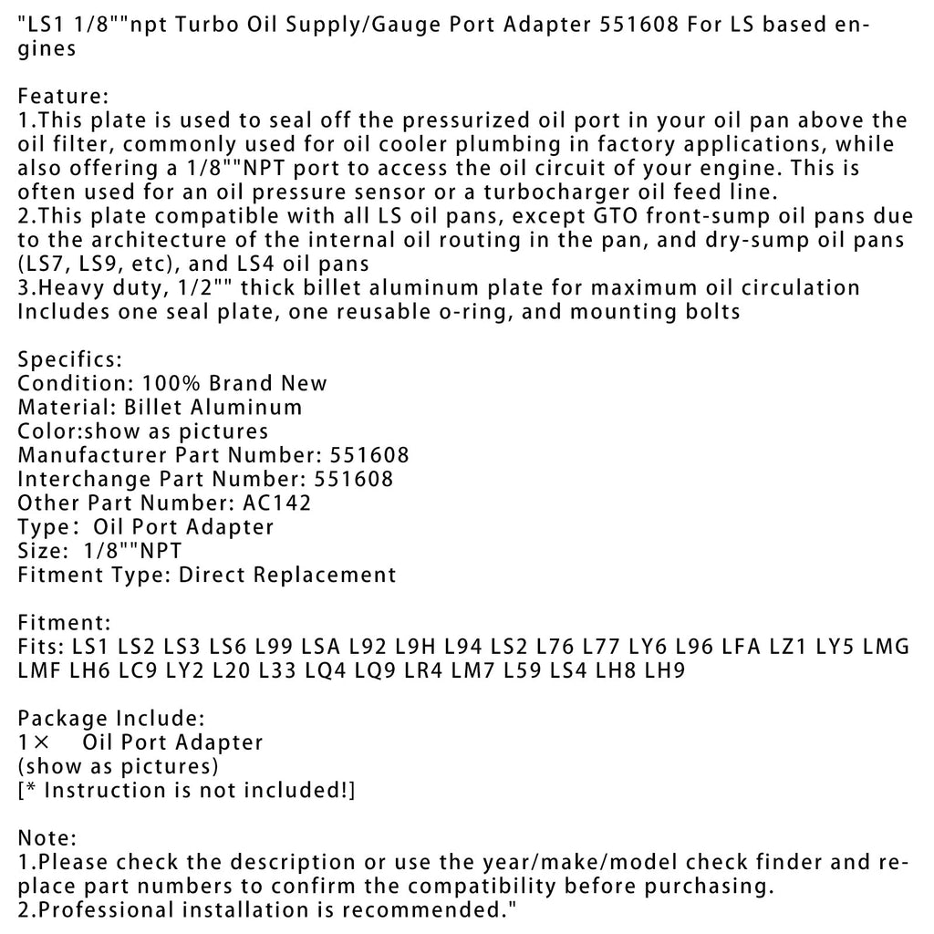 1. Ta płyta służy do uszczelnienia ciśnieniowego portu oleju w misce olejowej nad filtrem oleju, powszechnie stosowanego w instalacjach hydraulicznych chłodnicy oleju w zastosowaniach fabrycznych, zapewniając jednocześnie port 1/8" NPT umożliwiający dostęp do obwodu oleju silnika. Jest to często używany w czujniku ciśnienia oleju lub przewodzie doprowadzającym olej do turbosprężarki.