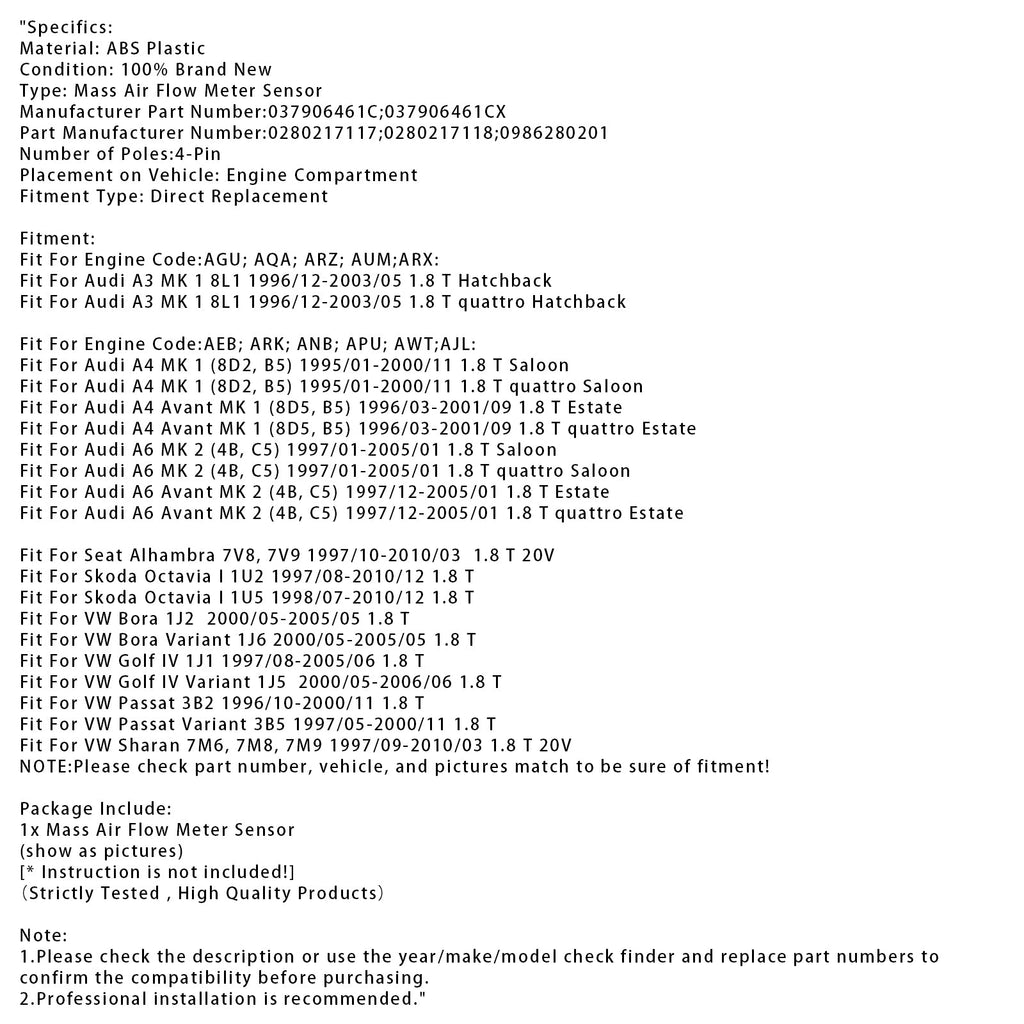 Czujnik przepływomierza masowego powietrza do Audi A3 A4 A6 1.8T VW Jetta Passat 0280217117