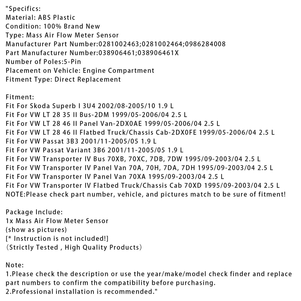 Czujnik przepływomierza masowego powietrza do VW Transporter IV Passat 3B Superb I 0281002463
