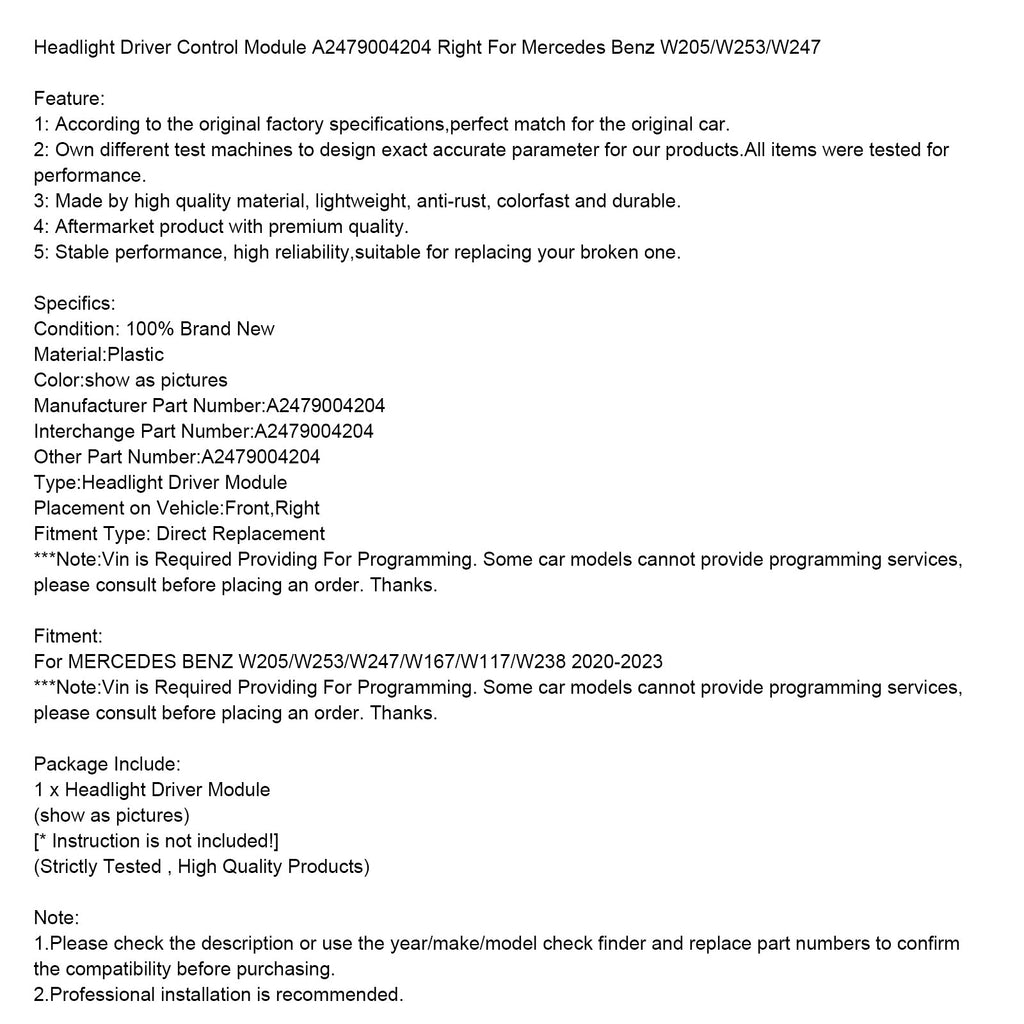 Moduł sterujący reflektorami A2479004204 kompatybilny z Mercedes-Benz W205/W253/W247