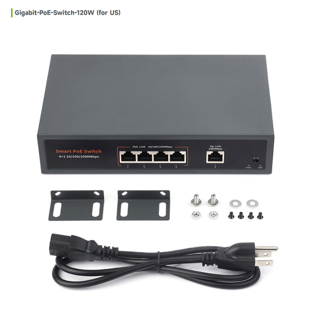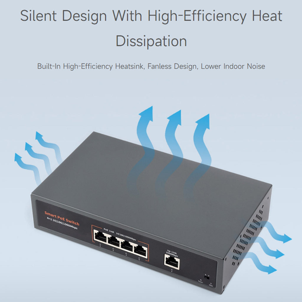 Niezależnie zaprojektowany i opracowany w celu zaspokojenia potrzeb w zakresie zasilania PoE, wykorzystuje nową generację szybkich chipów przełączających Ethernet i konstrukcję o dużej przepustowości płyty montażowej (zwanej również przepustowością przełączania). Posiada niezwykle szybkie możliwości przetwarzania danych i poprawia wydajność transmisji danych. Jest wyposażony w cztery porty downlink RJ45 zasilane przez PoE i jeden port uplink RJ45. Moc zasilacza pojedynczego portu może osiągnąć wartość szczytową 30 W, a moc szczytowa całej maszyny wynosi 120 W. Urządzenie może automatycznie wykrywać i identyfikować zasilane urządzenia zgodne ze standardem IEEE 802.3af/at oraz ustalać priorytet zasilania przez kabel sieciowy.