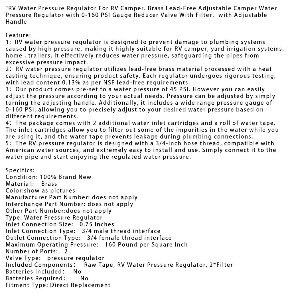 2. Regulator ciśnienia wody w kamperze (RV) wykonany jest z mosiądzu bezołowiowego, formowanego metodą termotopliwą, co gwarantuje bezpieczeństwo produktu. Każdy regulator przechodzi rygorystyczne testy, z zawartością ołowiu 0,13%, zgodnie z wymogami NSF.
