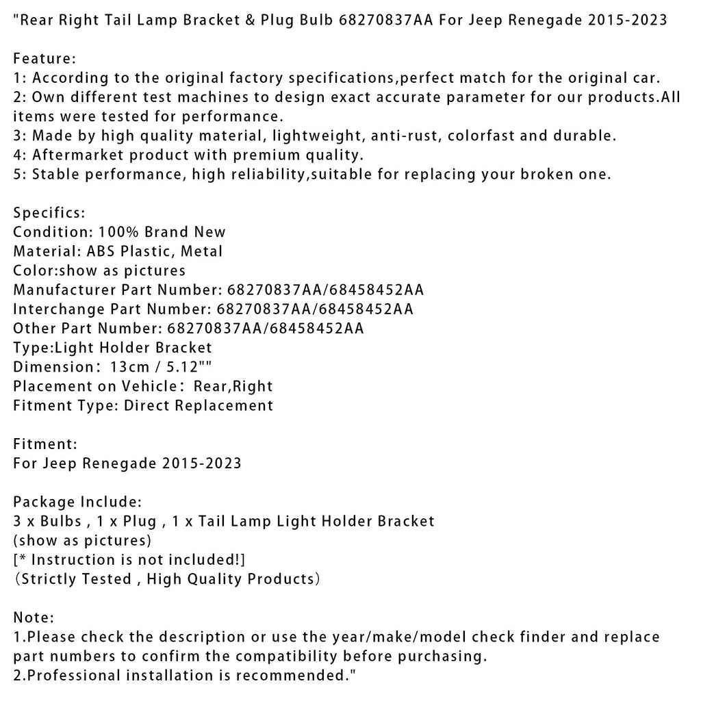 Prawy tylny uchwyt i gniazdo żarówki 68270837AA do Jeepa Renegade 2015-2023