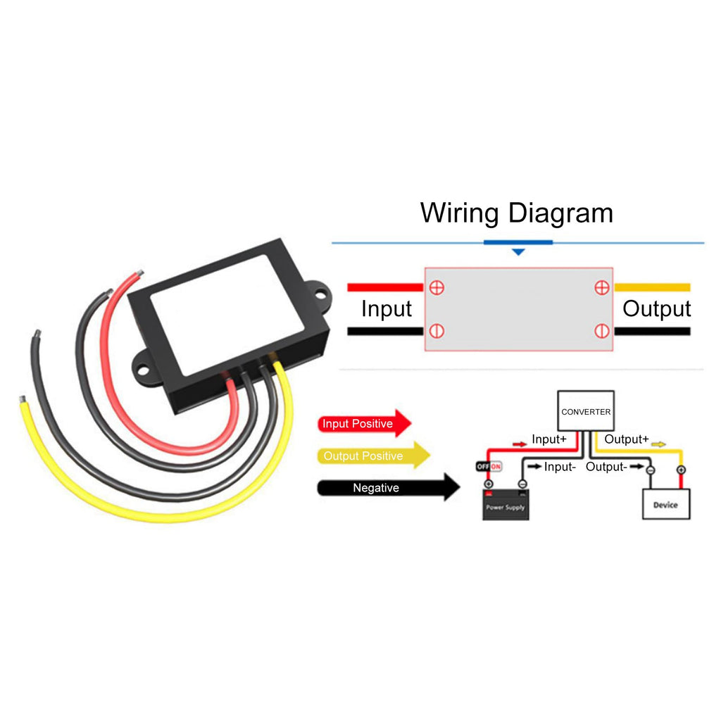 Kolor przewodu wejściowego: (+)czerwony, (-)czarny. Kolor przewodu wyjściowego: (+)żółty, (-)czarny.