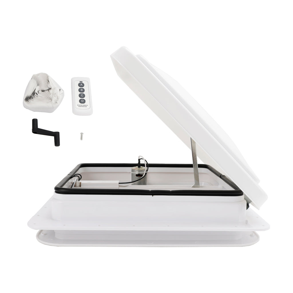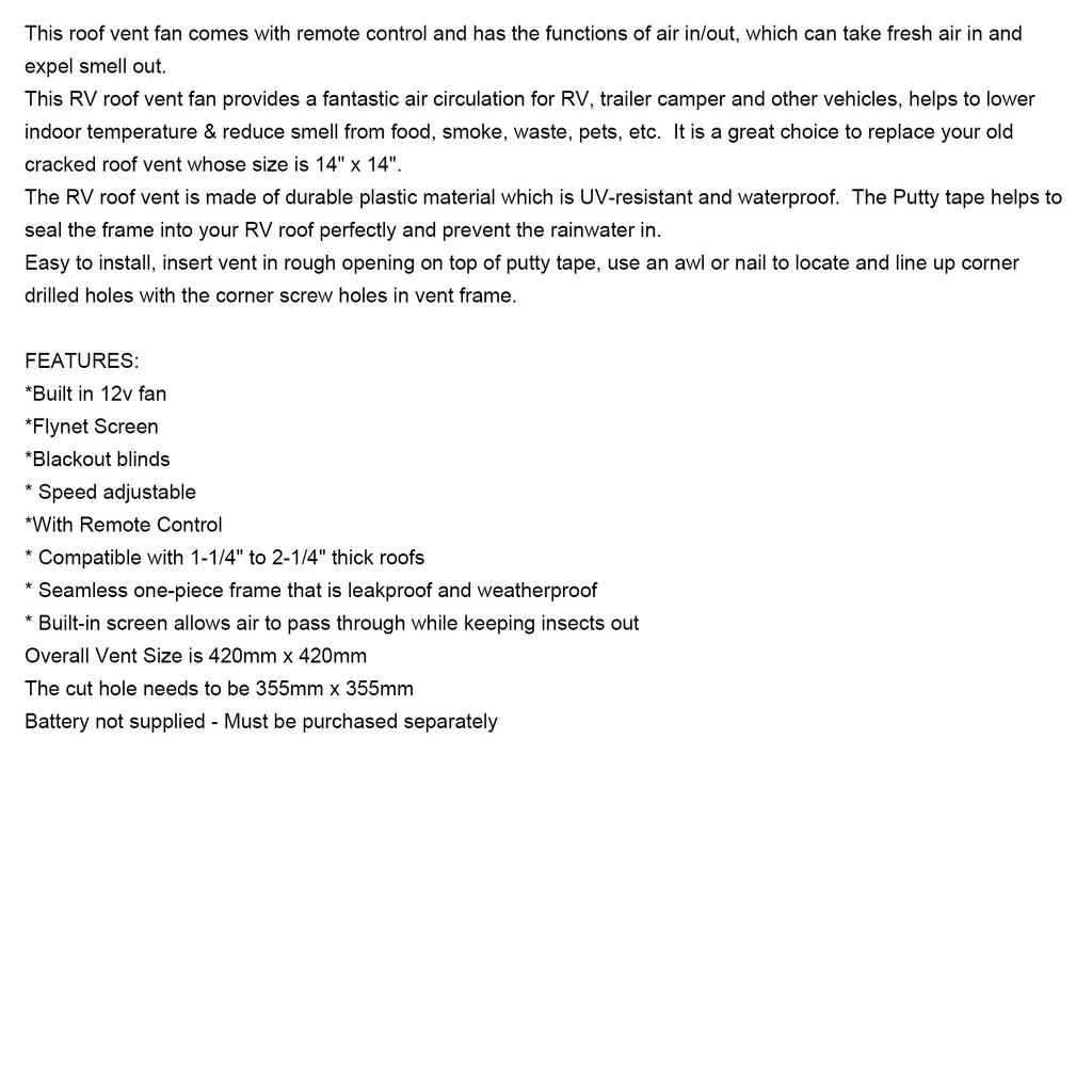 Ten wywietrznik dachowy do kamperów zapewnia doskonałą cyrkulację powietrza w kamperach, przyczepach kempingowych i innych pojazdach, pomagając obniżyć temperaturę wewnątrz i zredukować zapachy jedzenia, dymu, śmieci, zwierząt domowych itp. To doskonały wybór, aby wymienić stary, pęknięty wywietrznik dachowy. 14" X 14".
