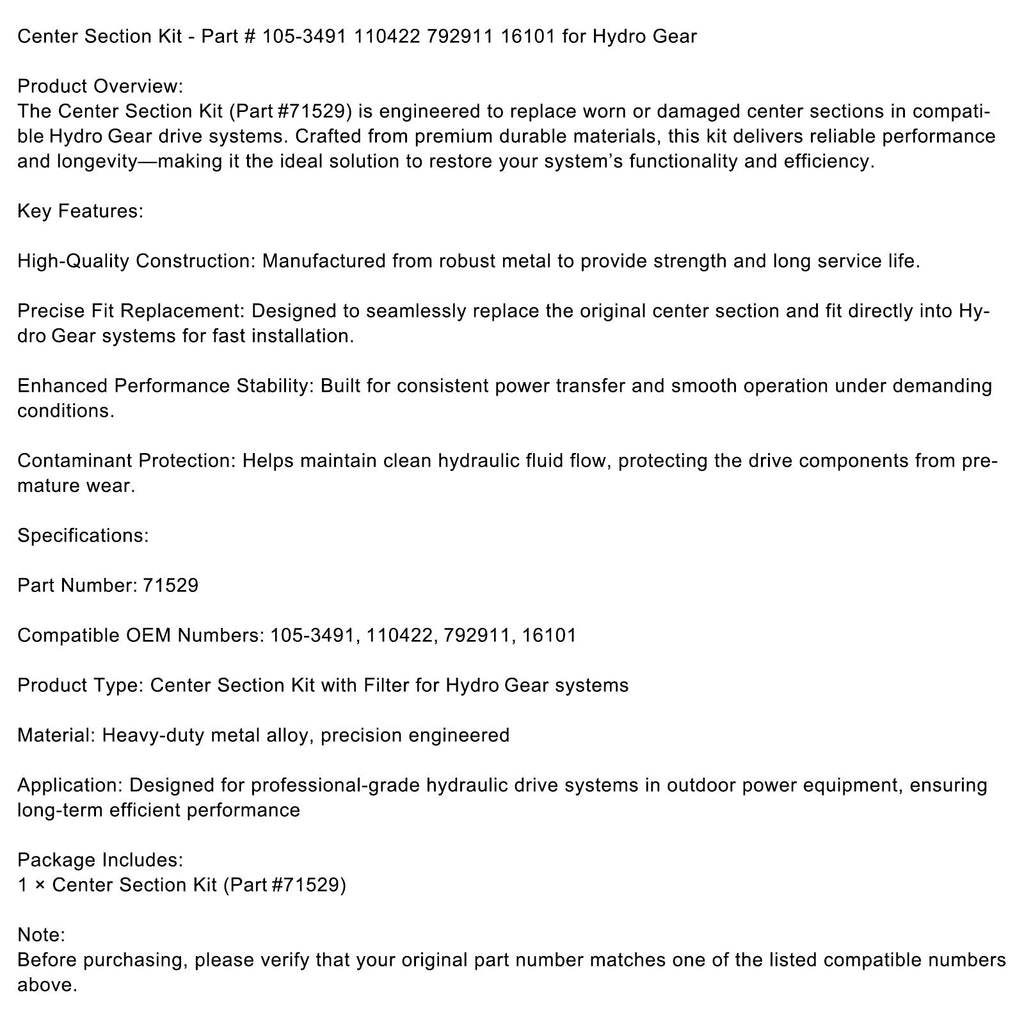 Kompatybilność: Zaprojektowane tak, aby pasować do systemów Hydro Gear, jako zamiennik starych lub uszkodzonych zestawów sekcji środkowej.